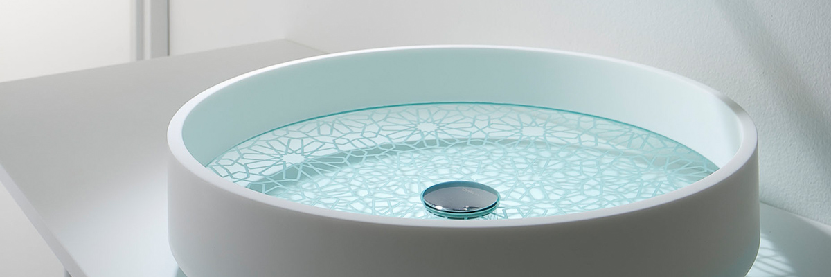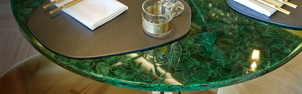 Produit 100% à partir de verre recyclé, c'est un modèle de technologie exemplaire qui se traduit par un matériau exclusif, durable et translucide. Intérieur et extérieur.